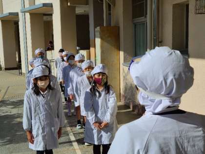 今日の給食は、豚肉のガーリック焼き、ケチャップ煮、うずら豆のグラッセ、パン、牛乳です。いただきます。