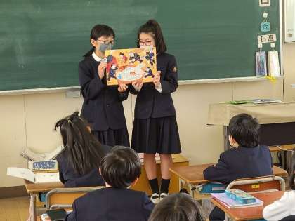 今日は1年3組で、図書委員による読み聞かせがありました。お姉さんたちに読んでもらって1年生もうれしそうでした。