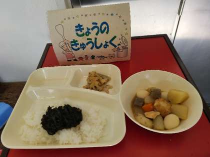 今日の給食は、関東煮、れんこんの梅風味焼き、のりのつくだ煮、ごはん、牛乳です。いただきます。