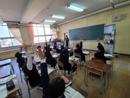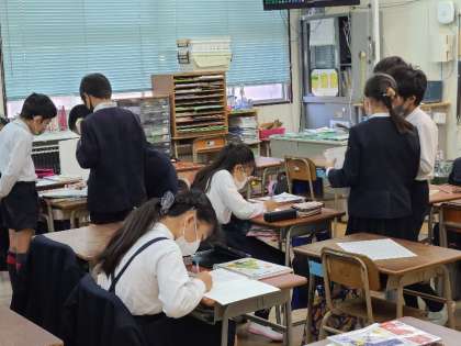 4年1組の算数の習熟度別授業の様子です。分数の足し算の仕方について学習しています。授業の中では何度もお友だちと考えを話し合う場面が見られました。
