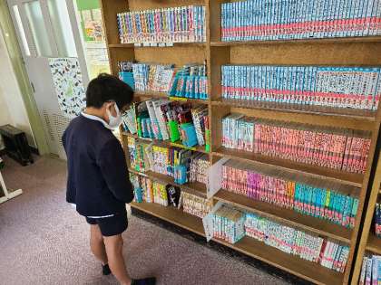 読書が大好きな児童です。「一番好きな本が見当たらない」と一生懸命探していました。