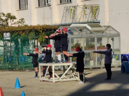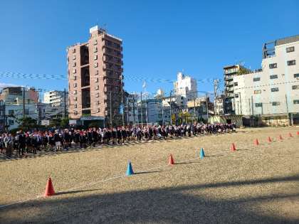 本日児童集会を運動場で行いました。集会委員が集合やゲームの説明をしっかりとおこないます。今日のゲームは、フープを2人一組で転がしてグループでリレーを行いました。