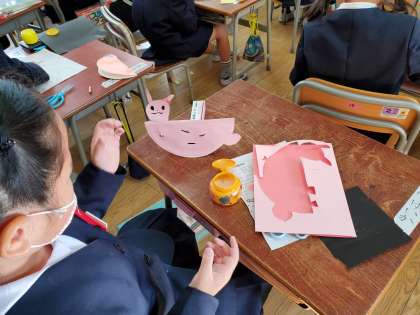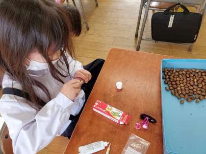図工の学習の場面です。左の写真は紙皿を使って揺れるおもちゃを作っています。いろいろなデザインを考えて作っていました。右の写真は先日、どんぐり拾いで拾ってきたどんぐりを使っておもちゃを作っています。どんぐりの形によって回り方が違うと発見していました。