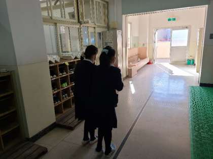 廊下を歩く姿が寒そうです。風邪をひかないようにしてください。