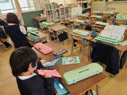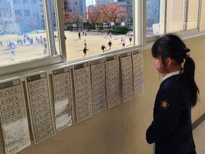 2年2組の様子です。次の授業の準備ができています。廊下に張り出された九九の表をみて学習している児童がいました。