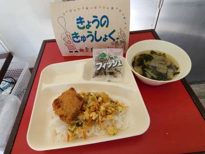 今日の給食は、カツ丼、すまし汁、ミニフィッシュ、牛乳です。いただきます。