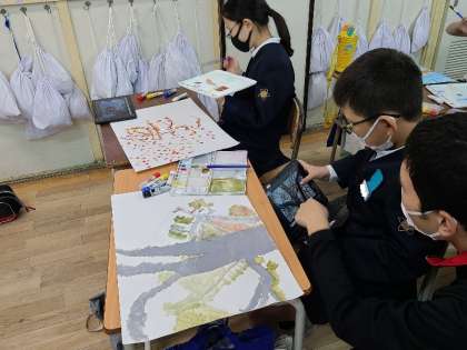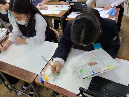4年2組の図工の様子です。「お気に入りの木を描こう。」です。赤、青、黄の3原色を使い描いています。