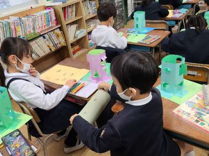 2年1組の図工の様子です。「まどから見えるものをあらわそう。」です。人物や昆虫など丁寧に描いて、窓から見えるようにします。