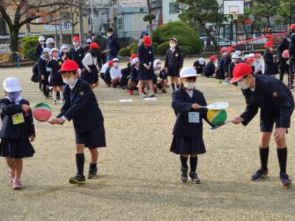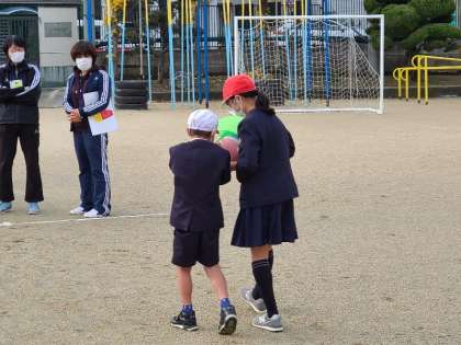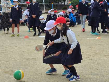 今日のゲームは、2人一組になりうちわでボールを運びます。高学年の児童がうまくリードしていました。