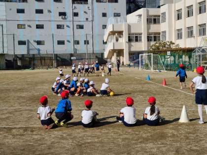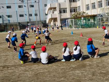 2年1組の体育のボールゲームの様子です。チームワークが大切なゲームです。楽しく活動しています。