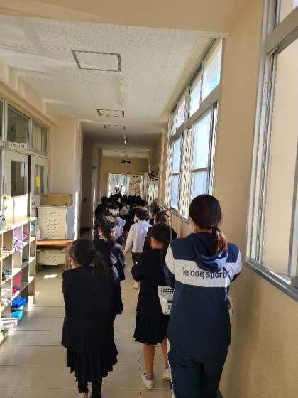 1年2組が図書館に移動して学習します。静かに整列して移動できていました。