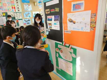 お店では、その国のことばで挨拶をします。その後は英語表現も活用してお買い物をします。買い物をした後は感想や気づいたことなどを書いて次回に活かせるようにしていました。とても楽しい授業でした。