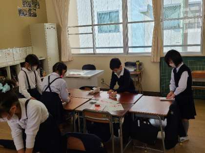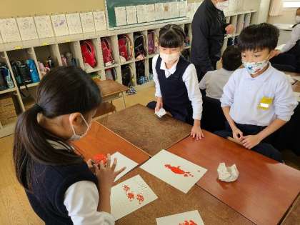 2年2組の図工の様子です。芋版を作っていました。