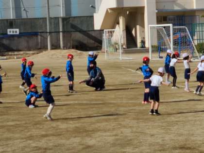 1年1組の体育の様子です。なわとびをしています。なわを上手く回せるようになってきました。後ろ跳びもできます。