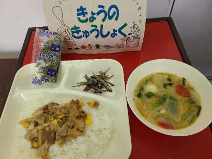 今日の給食は、れんこんのちらしずし、ぞう煮、ごまめ、牛乳です。今日は正月の行事献立です。いただきます。