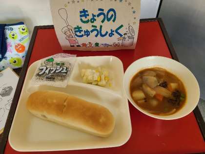今日の給食は、ビーフシチュー、カリフラワーのピクルス、ミニフィッシュ、パン、牛乳です。いただきます。