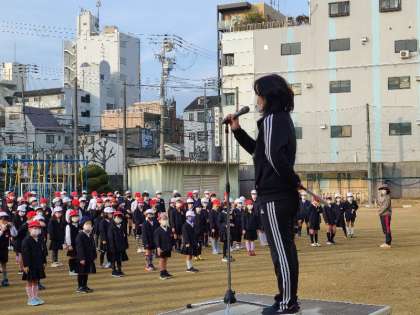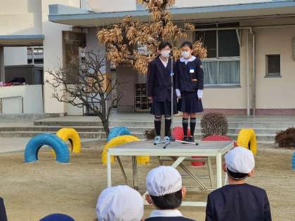 本日運動場で児童朝会を行いました。賞の伝達、保健委員会、週目標についてお話がありました。今週の目標は、「進んであいさつをしよう」です。