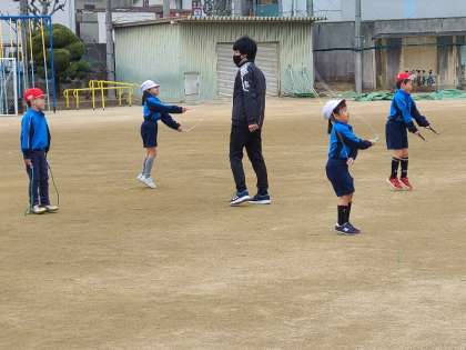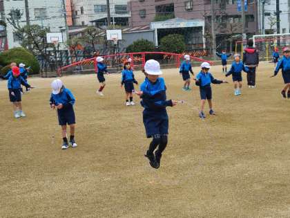1年1組の体育の様子です。あや跳びも上手にできるようになりました。