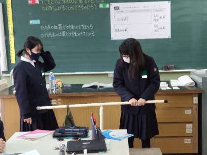 6年2組の理科の様子です。てこの学習です。力点や作用点の位置を動かして重さを確認しています。