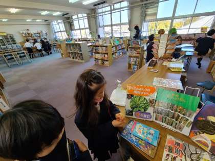 1年生がたくさん来館してくれました。今日は図書館司書の羽山先生もきています。たくさん本のことを教えてもらってください。