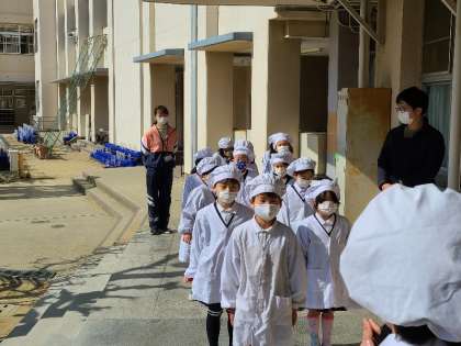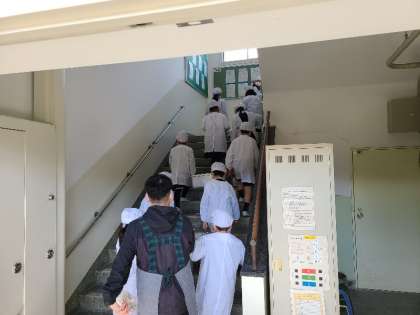 今日の給食は、押麦のグラタン、スープ、いよかん、パン、牛乳です。いただきます。