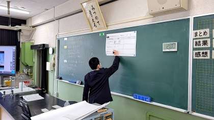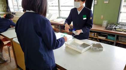 6年1組の理科の様子です。手回し発電機と乾電池の違いについて実験をしています。