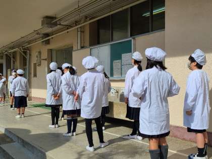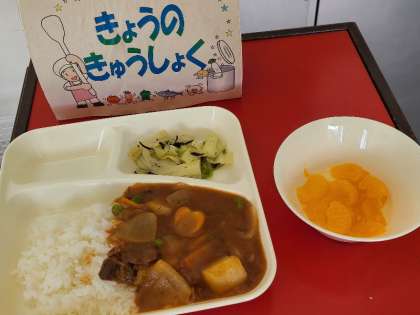 今日の給食は、ハヤシライス、キャベツのひじきドレッシング、みかん(缶)、牛乳です。いただきます。