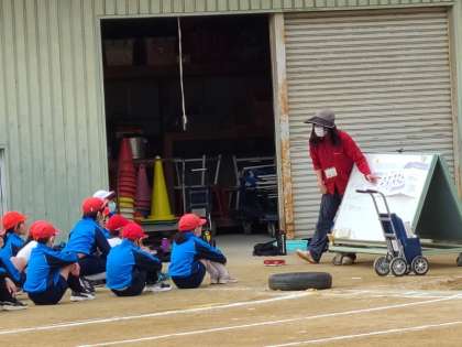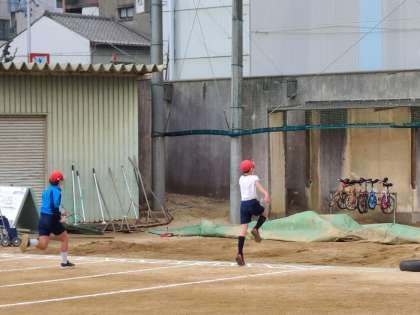 5年1組の体育の様子です。幅跳びをしています。助走を速く走って踏み切る練習をしていました。