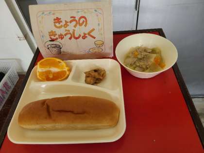 今日の給食は、鶏肉のみそバターソース、洋風煮、デコポン、パン、牛乳です。いただきます。