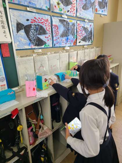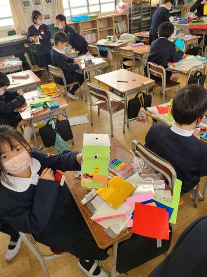 1年2組の図工の様子です。箱の中から何かが飛び出してきます。