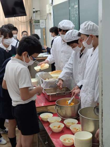 6年生は、最後の給食です。たくさん食べてください。調理人さんの計らいで、押麦のスープに入っている人参は、桜の形です。ありがとうございます。