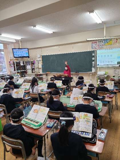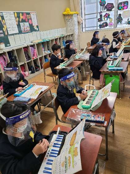 2年1組の音楽の様子です。フェースシールドをして男女別にリコーダーの演奏をしています。