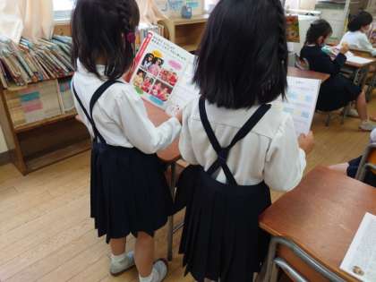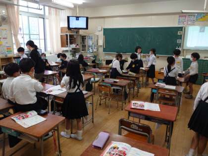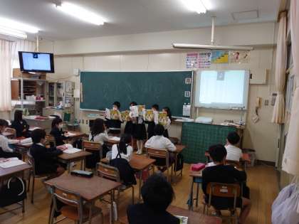 2年生【音楽】「メッセージ」という、いろんな国のあいさつが出てくる歌を、グループで役割分担して歌いました。