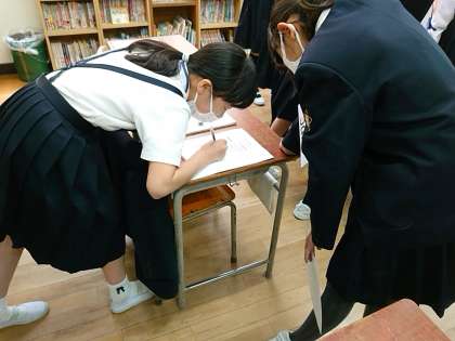 自分で作ったマイサインを自己紹介とともにカードに書きます。