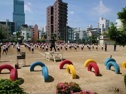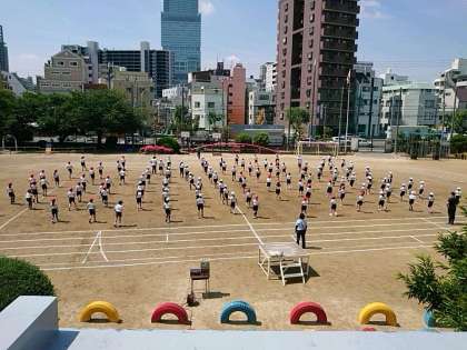 3年生と4年生も運動場に出て、隊形の確認をしながらダンスの練習をしました。