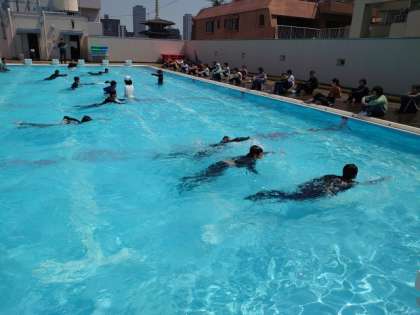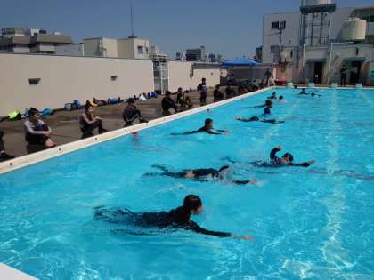 服を着て水に入ると、重さがずいぶん違うことや、泳ごうとすると服が邪魔になってうまく泳げないことを実際に体験しました。