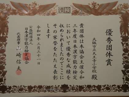 昨年度実施した漢字検定で、本校が優秀団体賞を受賞しました。