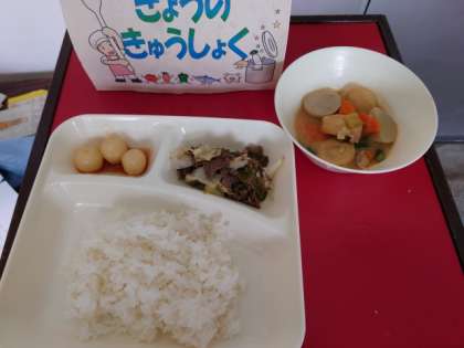 今日のメニューは一口がんもと里いもの味噌煮、牛肉と野菜の炒め物、みたらし団子です。