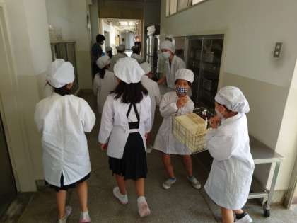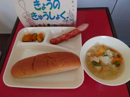 今日のメニューは、ウインナーのケチャップソース、スープ、焼きカボチャです。