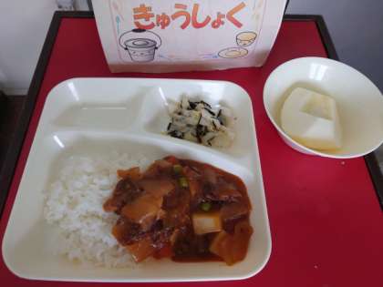 今日のメニューは、ハヤシライス、キャベツのひじきドレッシング、りんごです。