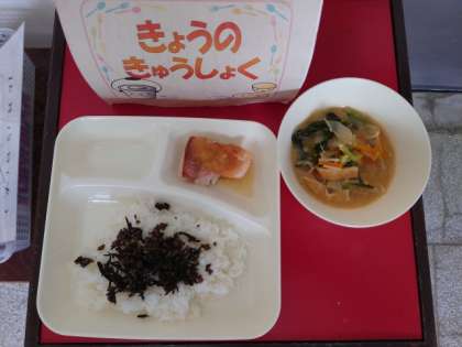今日のメニューは、あかうおのみぞれかけ、みそ汁、牛ひじきそぼろです。
