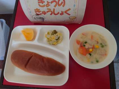 今日のメニューは、豆乳コーンクリームシチュー、はくさいのピクルス、かき(ひらたねなし柿)です。