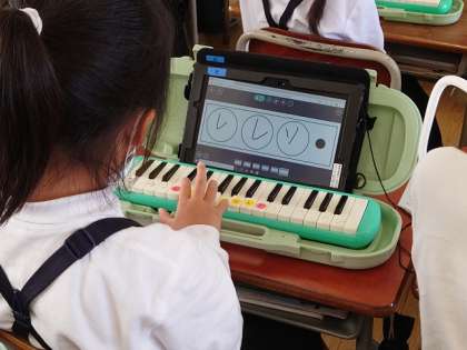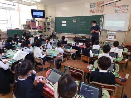みんなが作った旋律を、先生が次々とタブレットに表示して、それをみんなでつなげて演奏します。
