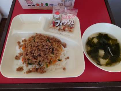 今日のメニューは、ビビンバ、わかめスープ、アーモンドフィッシュです。
