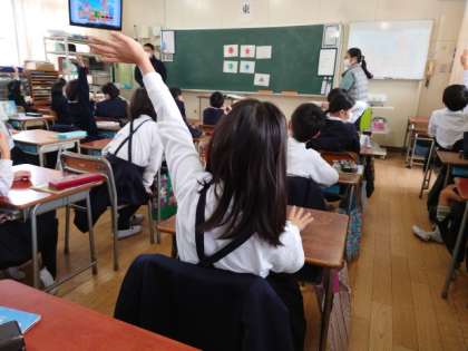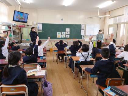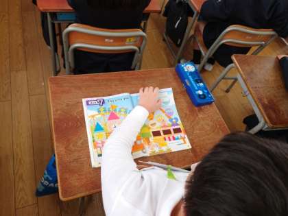 色や形を英語で言いながら、先生が隠したカードを当てるゲームをしました。