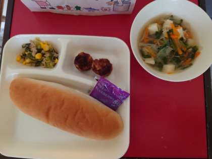 今日のメニューは、あげシューマイ、中華スープ、ツナとチンゲン菜のいためものという中華風です。