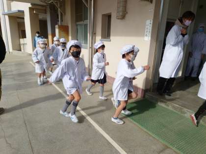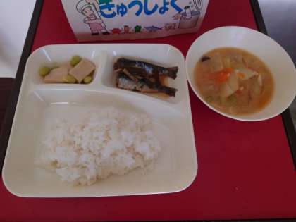 今日のメニューは、いわしのしょうが煮、みそ汁、高野どうふの煮ものです。