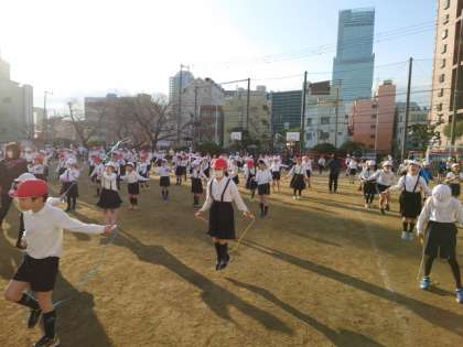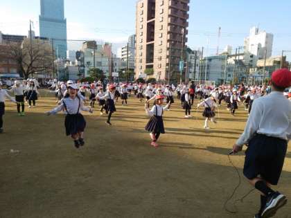 運動場に出てきた時には、「寒い〜。」と言っていた声も、音楽に合わせてなわとびをすると、「あたたかい〜。」に変わっていました。