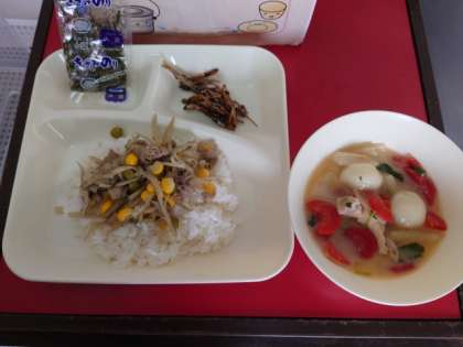 今日のメニューは、きんぴらちらし、ぞう煮、ごまめです。