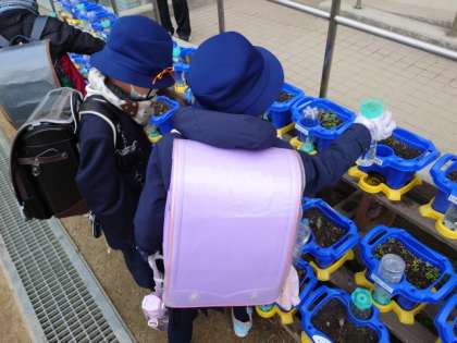1年生は、教室に上がる前にチューリップに水やりをしています。